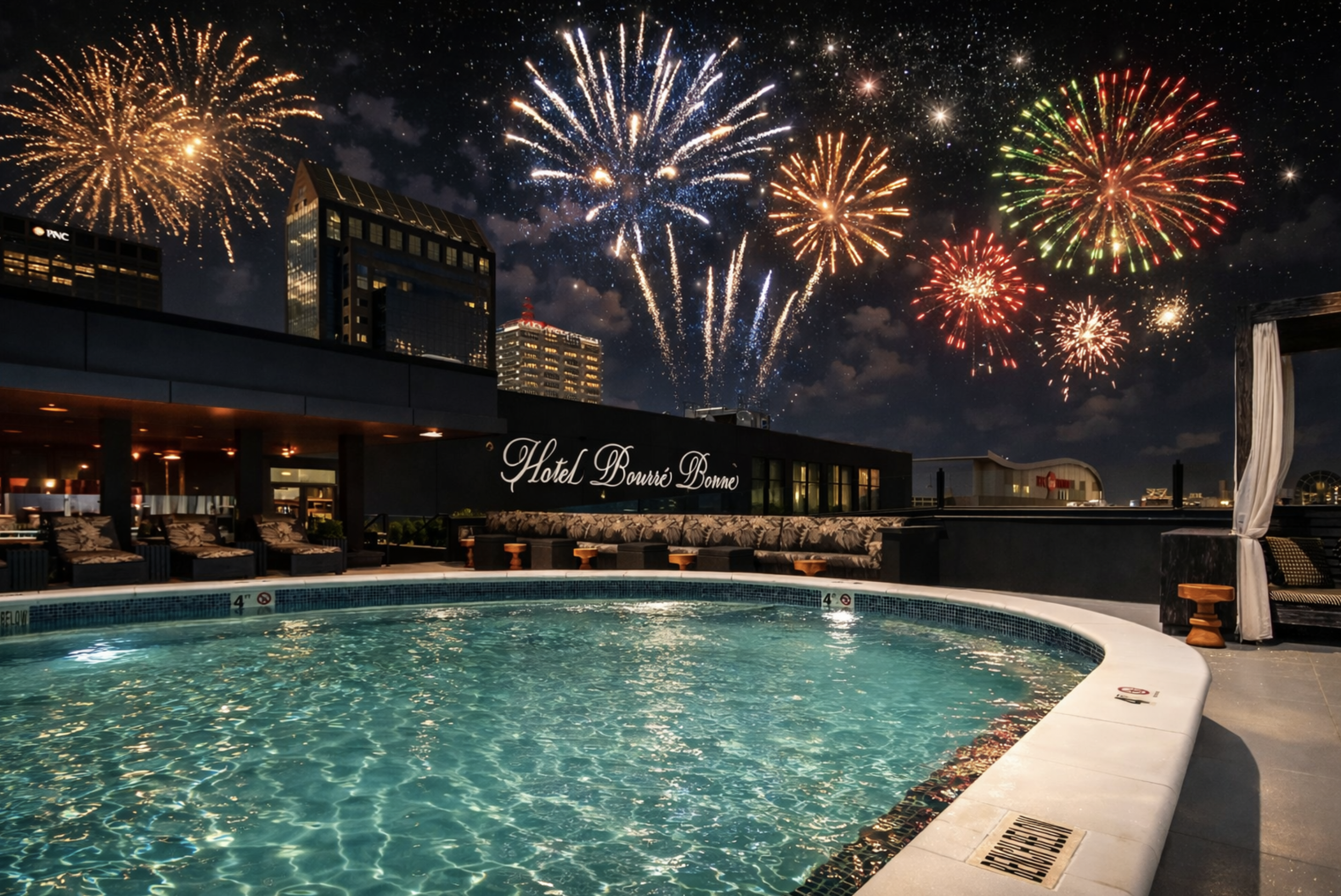 Ticketed entry includes access to Hotel Bourré Bonne’s Rooftop Pool Deck, Outdoor Rooftop Bar, Indoor Rooftop Party Bar, and ballroom, creating multiple indoor and open-air spaces to take in unmatched skyline perspectives. From the rooftop’s sweeping views to the comfort of the indoor lounge and ballroom, every space is designed to deliver a refined, memorable atmosphere throughout the evening.
